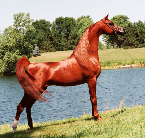 Yes, he had plastic surgery on his throat latch area and then was able to keep showing. Notice the really flat topline. The next photo is one of his offspring, Magdalene (Image) and note the more seahorse looking head. Also a fairly flat topline... not great for riding, but certainly wins a lot in the halter venues.